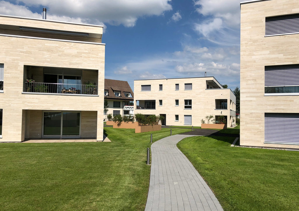 Das in einer modernen Architektursprache gestaltete Ueberbauungskonzept integriert das bestehende Mehrfamilienhaus mit 6 Wohnungen und bildet somit ein stimmiges Ensemble. Insgesamt werden 20 Mietwohnungen mit Wohnungsgrössen von 2 1⁄2, 3 1⁄2 und 4 1⁄2 Zimmern realisiert. Die Einstellhalle umfasst 37 Parkplätze welche auch der Parkierung für das bestehende Mehrfamilienhaus dienen. Die Wohnungen sind „hindernisfrei“, das heisst, ohne Schwellen und verfügen über eine Komfortlüftung. Jedes Haus hat eine Liftanlage von der Einstellhalle bis ins Attika. Das Raumangebot jeder der funktionellen Wohnungen wird mit einem grossen Aussenraum ergänzt, sei es als gedeckter Sitzplatz, Balkon oder Terrasse. Die grosszügige Gartenanlage mit Spielplätzen und Gemeinschaftsbereichen ergeben eine hohe Qualität des Wohnens.